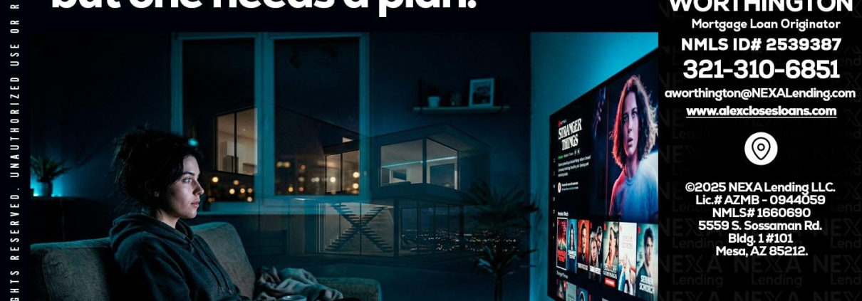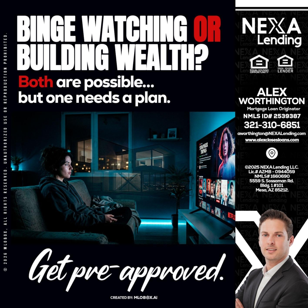 BINGE WATCHING - Alex Worthington -Mortgage Loan OriginatorHi, my name is Alex Worthington. I’m a Loan Officer with NEXA Lending LLC., offering personalized mortgage solutions, fast customized quotes, great rates and service with integrity.