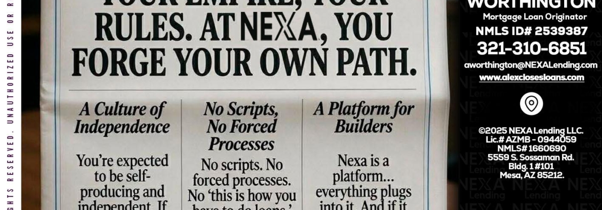 Hi, my name is Alex Worthington. I’m a Loan Officer with NEXA Lending LLC., offering personalized mortgage solutions, fast customized quotes, great rates and service with integrity.
